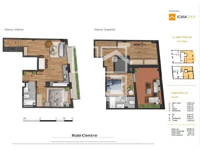 ¿Te imaginas vivir en un piso nuevo en el centro de Rubí?. Ahora es posible, no dejes escapar la oportunidad de estrenar piso y disfrutar de la calidad de vida que te ofrece vivir rodead@ de todos los servicios y comercios, supermercados, escuelas, a un paso del mercado municipal y a 5 minutos andando de la estación de los Ferrocarriles Catalanes. Todavía estás a tiempo, ¡ÚLTIMAS VIVIENDAS DISPONIBLES! A continuación te presentamos este precioso ático dúplex de obra nueva con solárium. La vivienda dispone de 97.44m2 construidos y 68,58m2 útiles distribuidos de la siguiente forma: Primera planta: -Salón comedor de 22,61m2 con salida a balcón -Balcón de 5.94m2 -Cocina americana equipada con vitrocerámica, horno y campaña extractora. Instalación para lavavajillas y lavadora. -Habitación doble de 9.36m2 -Baño 3.76m2 con plato de ducha Segunda planta: -Habitación/Estudio de 8.48m2 con salida a solarium -Baño suitte de 4.12m2 con plato de ducha -Trastero de 11,49m2 -Solarium de 14,77m2 Los suelos son de parquet sintético flotante acabado madera y gres en cocina y baños, la carpintería interior de madera semi-lacada en blanco, la exterior de aluminio, practicables y batientes con cristales dobles. Puerta blindada Dispone de aire acondicionado y calefacción mediante splits y agua caliente sanitaria mediante aerotermia. Posibilidad de adquirir plaza de parquing y trastero en la misma finca. Precios a consultar. Fecha de entrega estimada a consultar Llámanos cuanto antes y te informaremos en detalle.